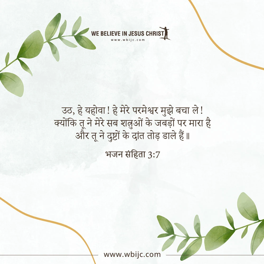 | उठ, हे यहोवा! हे मेरे परमेश्वर मुझे बचा ले! क्योंकि तू ने मेरे सब शत्रुओं के जबड़ों पर मारा है और तू ने दुष्टों के दांत तोड़ डाले हैं॥ भजन संहिता 3:7 |